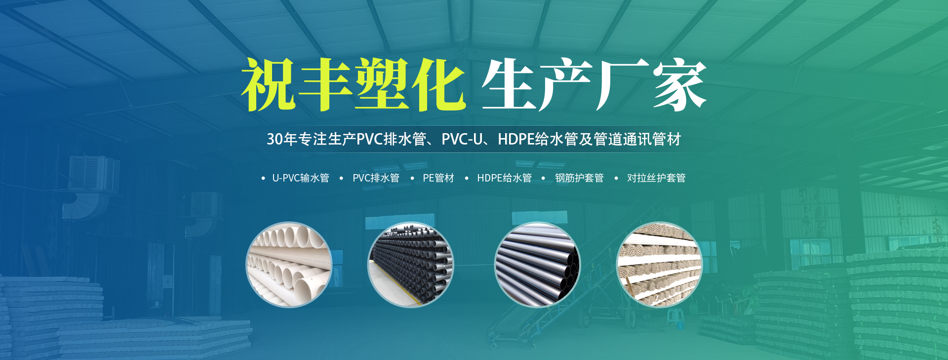 安陽市祝豐塑化有限公司坐落在滑縣工業(yè)園區(qū),東臨大廣高速,西臨京珠高速,是鄭州、鶴壁、安陽、濮陽四個城市的輸紐,交通便利、環(huán)境優(yōu)美。       公司始建于八十年代,經(jīng)過二十余年的艱辛創(chuàng)業(yè),規(guī)模不斷壯大,由十多萬元資產(chǎn)的小廠,發(fā)展到現(xiàn)占地面積達(dá)一萬多平,建筑面積一萬平,資產(chǎn)2000多萬元管材生產(chǎn)企業(yè)。公司生產(chǎn)PVC-U、PVC排水管、HDPE給水管、鋼筋護(hù)套管管道通訊管材等產(chǎn)品,廣泛用于農(nóng)田節(jié)水、高山引水、人畜用水、建筑、電力通訊等多種用途,品種齊全。為了滿足用戶需求,可承攬各種給水、節(jié)水、灌溉工程。“祝豐塑化”憑借強勁的實力,優(yōu)良的管理水平。“以質(zhì)量求生存,以信譽求發(fā)展”的原則全力以赴和大家共同塑造美好未來。..